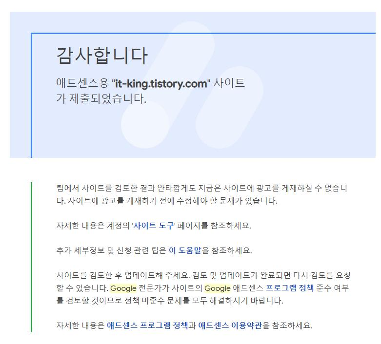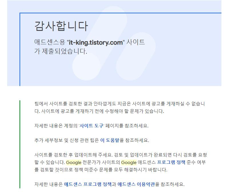 티스토리도 구글 애드센스를 적용할 수 있다는 것을 알고서는 구글 애드센스를 신청해봤답니다 처음 신청한건 8월 말이에요