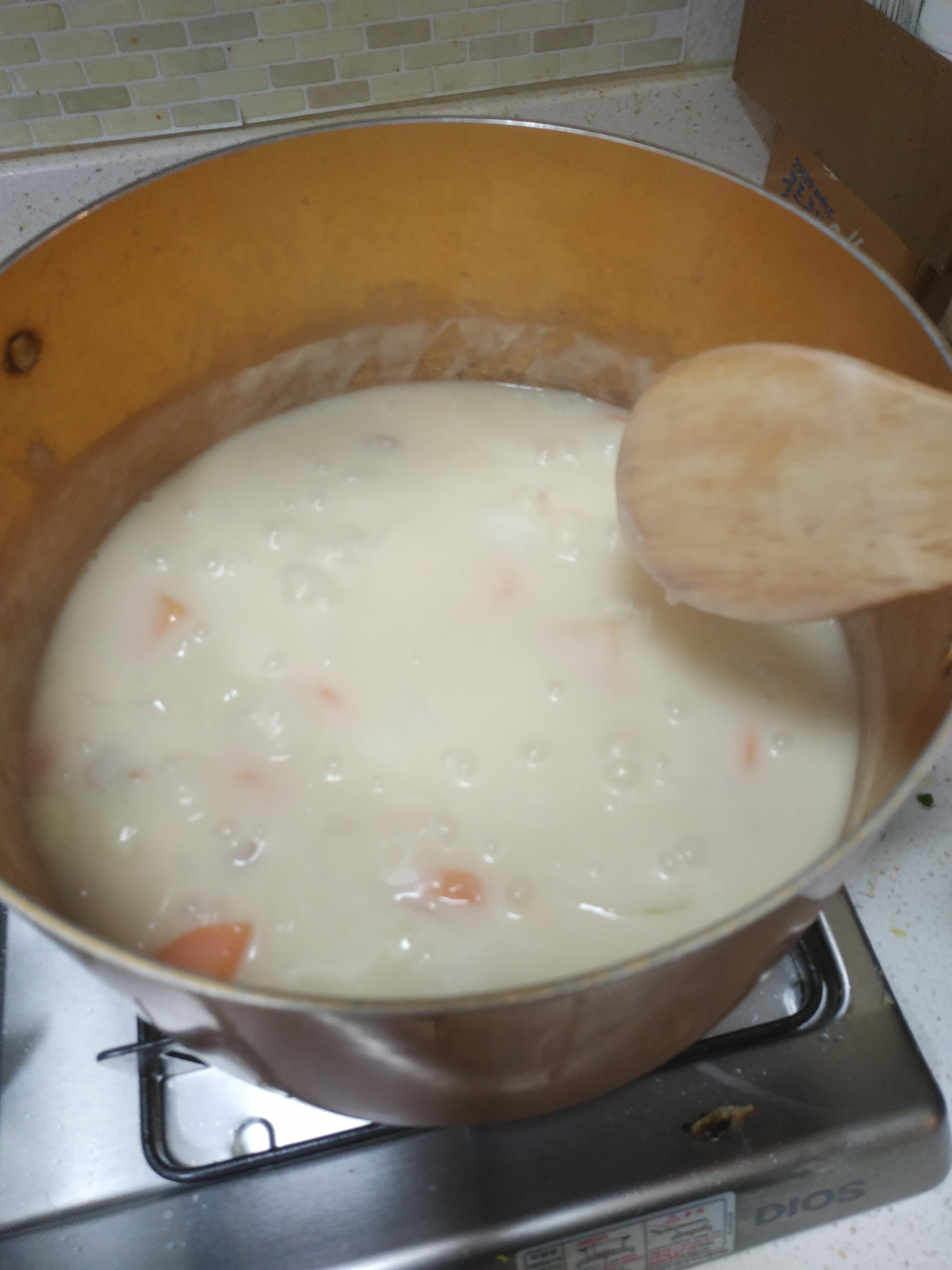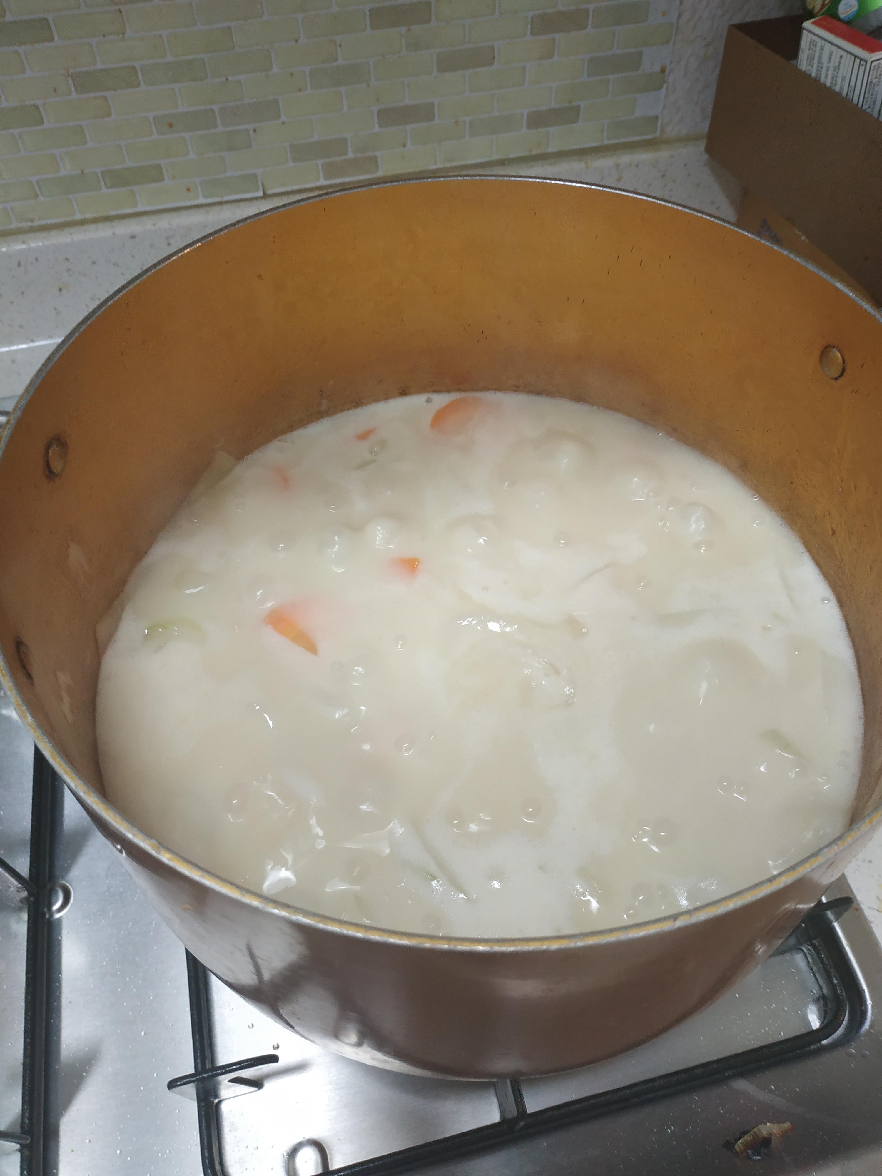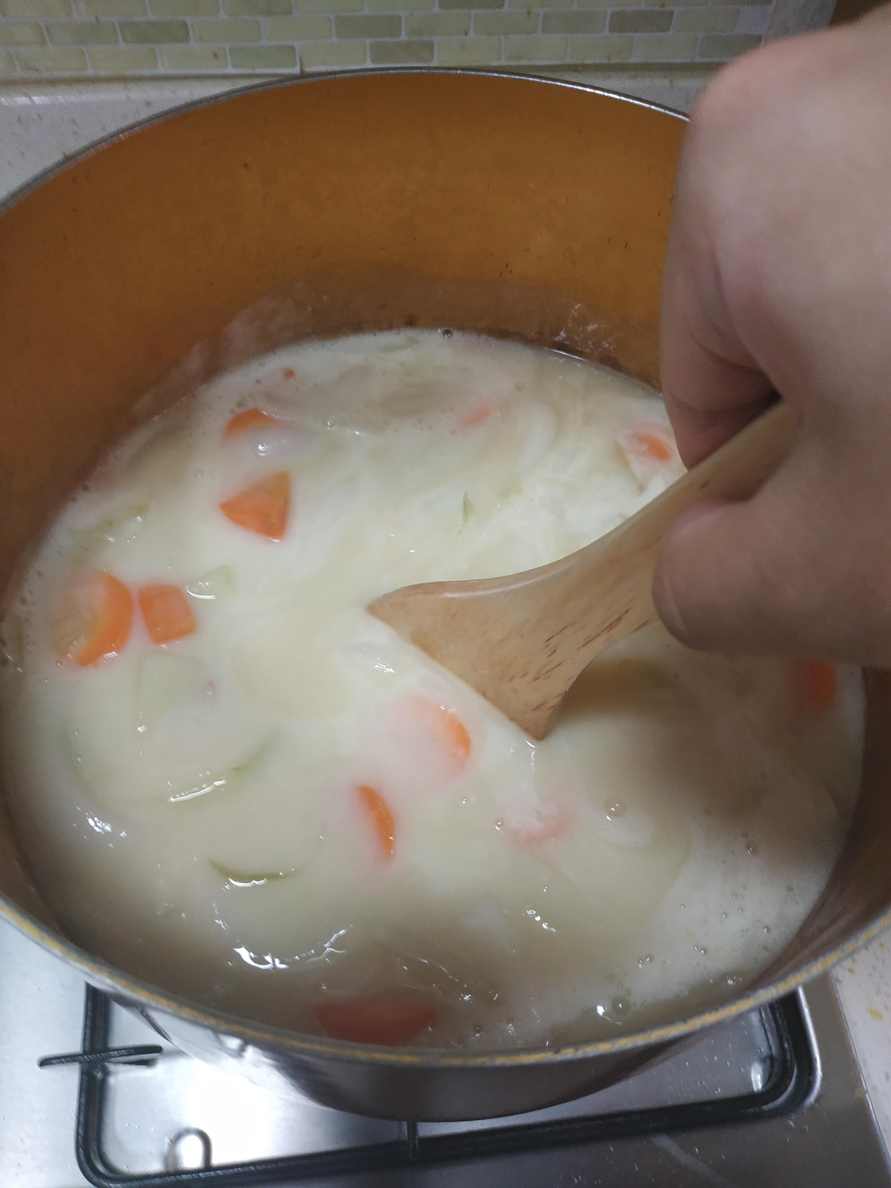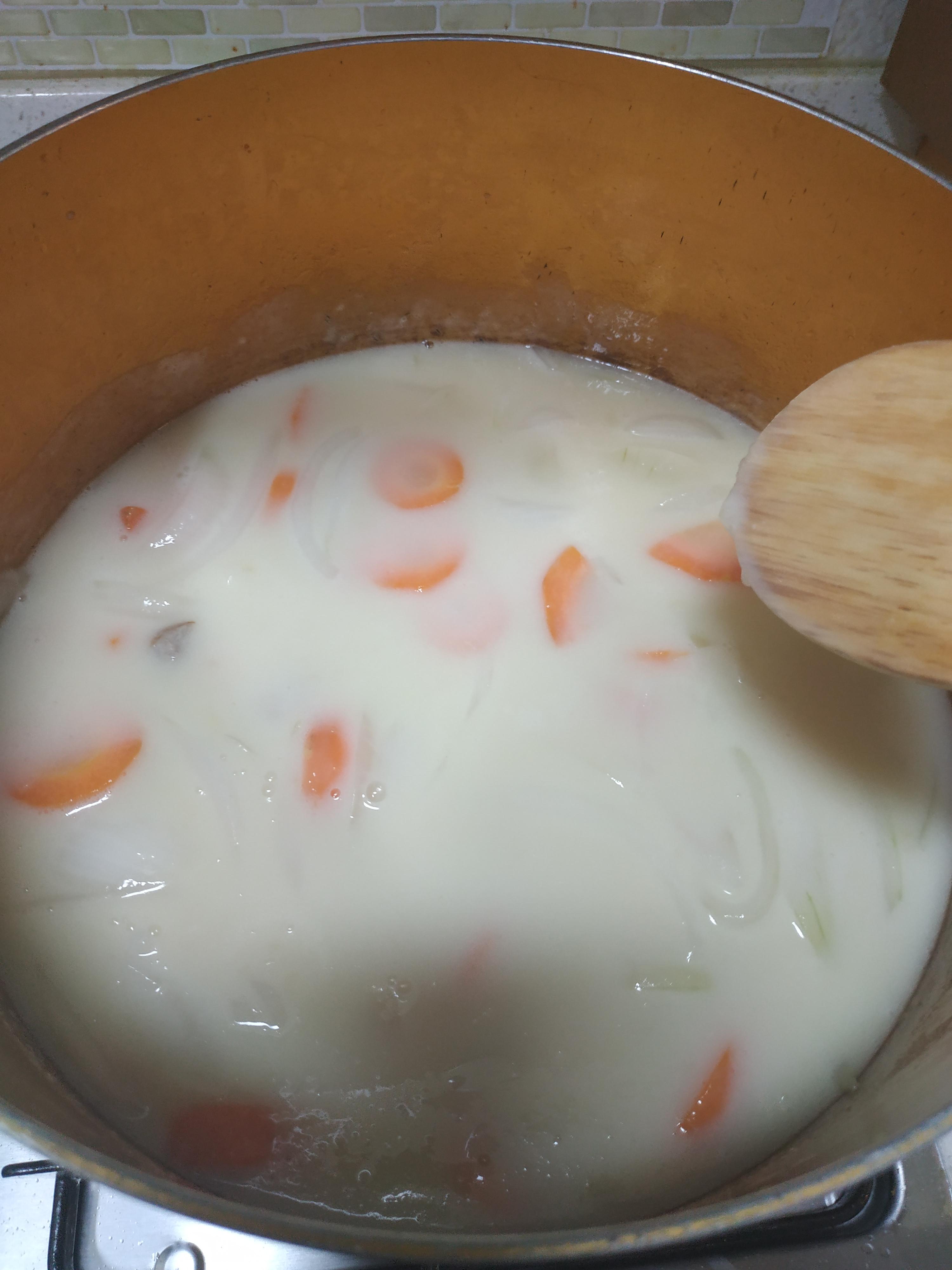 우유를 넣습니다 이제 좀 크림스튜 같네요