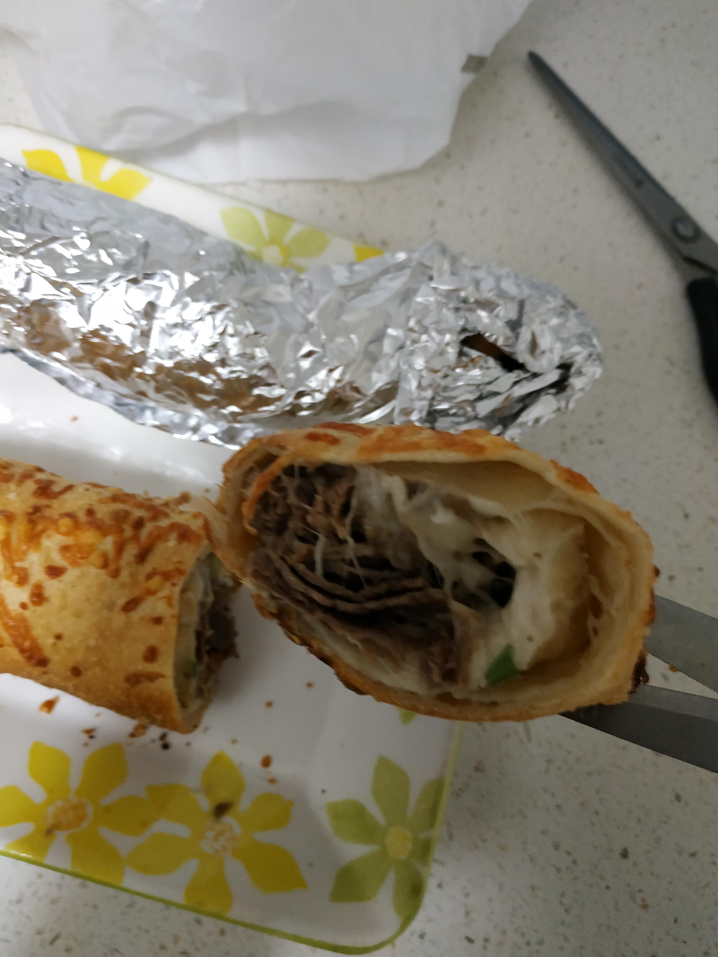 가위로 반을 자릅니다 불고기가 꽉 차 있고 치즈랑 파도 들어가있습니다