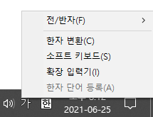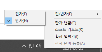 이럴때는 작업표시줄 '한'자 왼쪽에 있는 가/A를 우클릭해서 전/반자를 선택해줍니다
