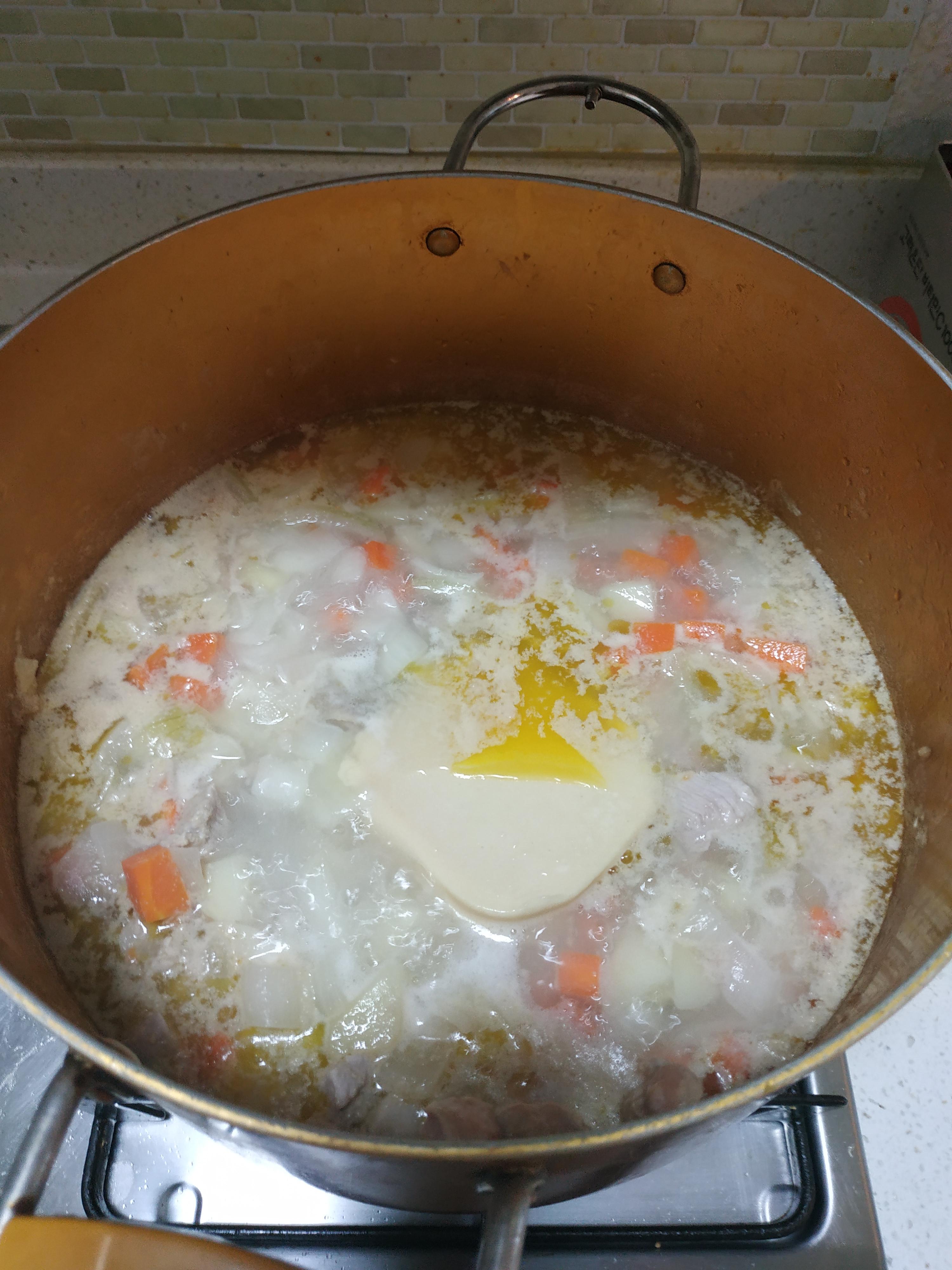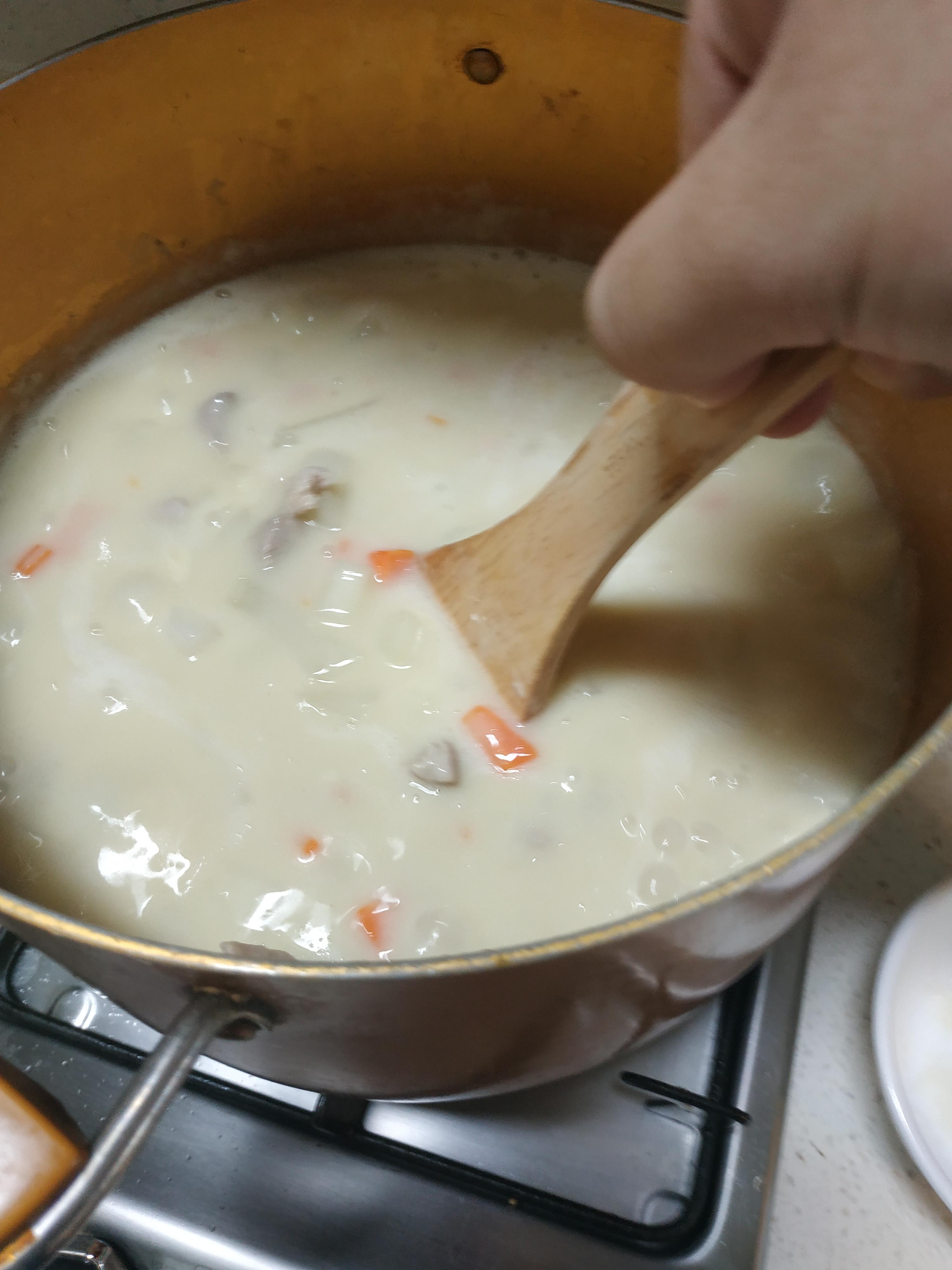 이제야 좀 크림스튜다워졌네요 그런데 이게 끝이 아니라 우유까지 넣어야합니다 그래야 진정한 크림스튜가 완성되죠