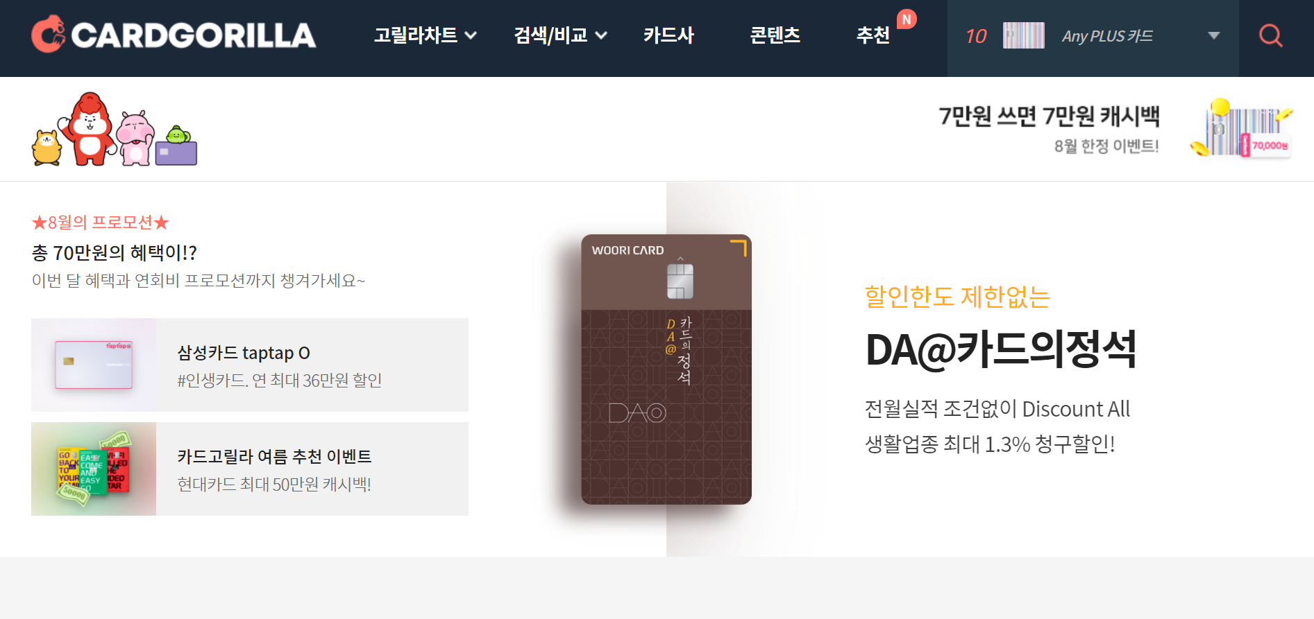 국내 최대 신용카드사이트, 카드고릴라! 실시간 인기차트, 혜택검색비교, 카드전문에디터들의 영상, 글 리뷰까지 꼼꼼히 체크해보세요!