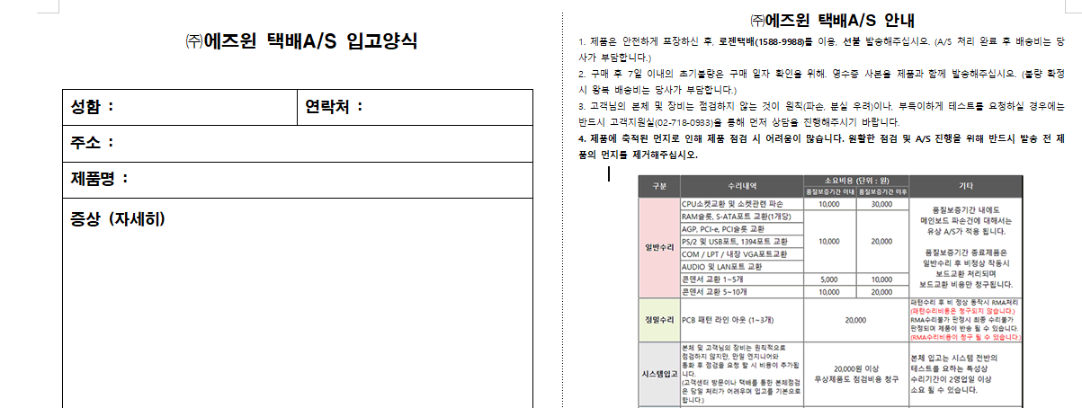 6.아래에 첨부한 택배이용양식을 프린트해서 메인보드와 함께 넣어서 보내주세요