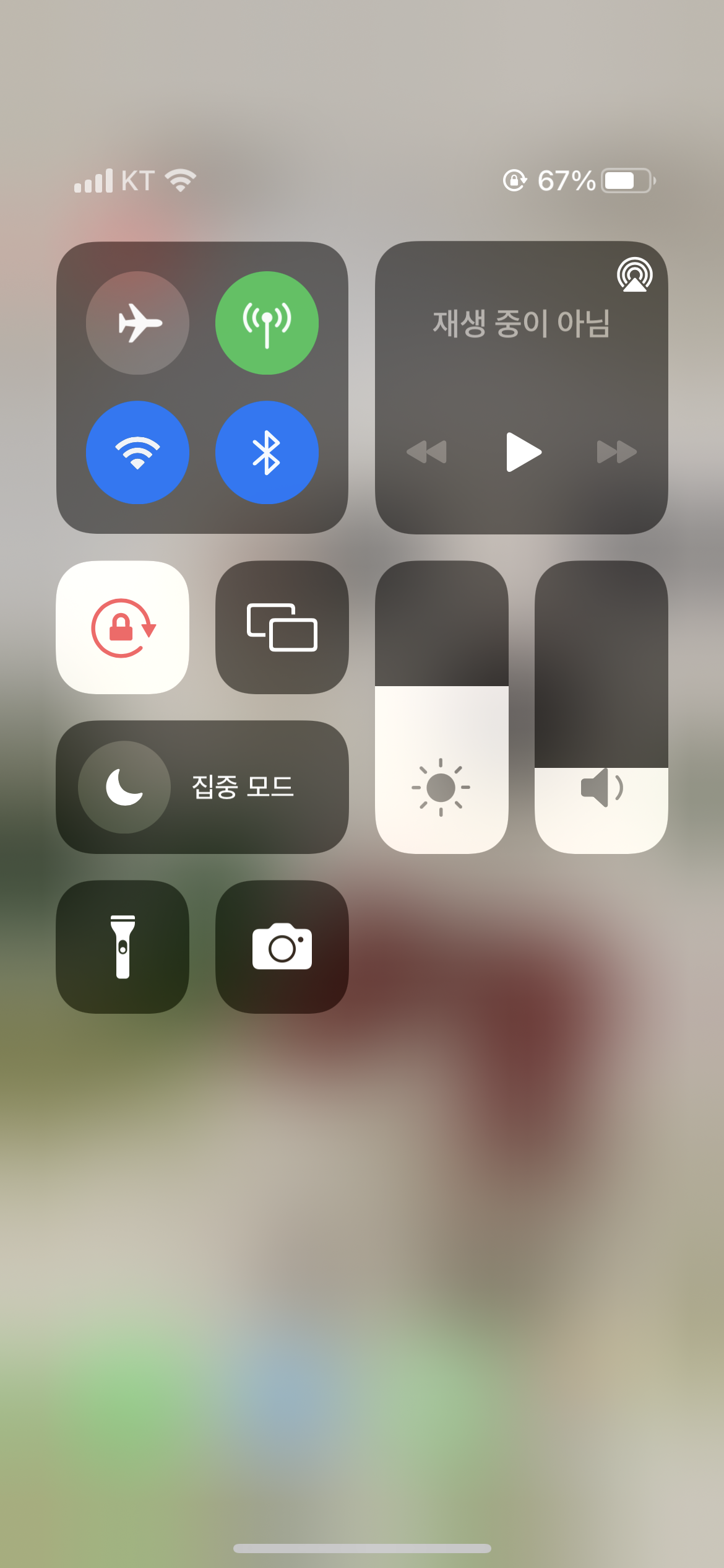 홈 화면에서 휴대폰 스크린을 밑으로 쓸어내리면 "제어 센터"가 나옵니다